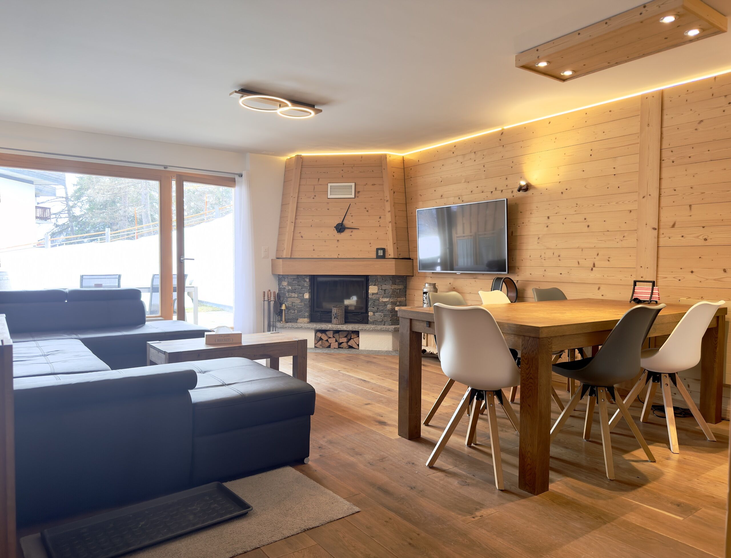 - A beautiful living room with fireplace and access to the south-facing terrace;