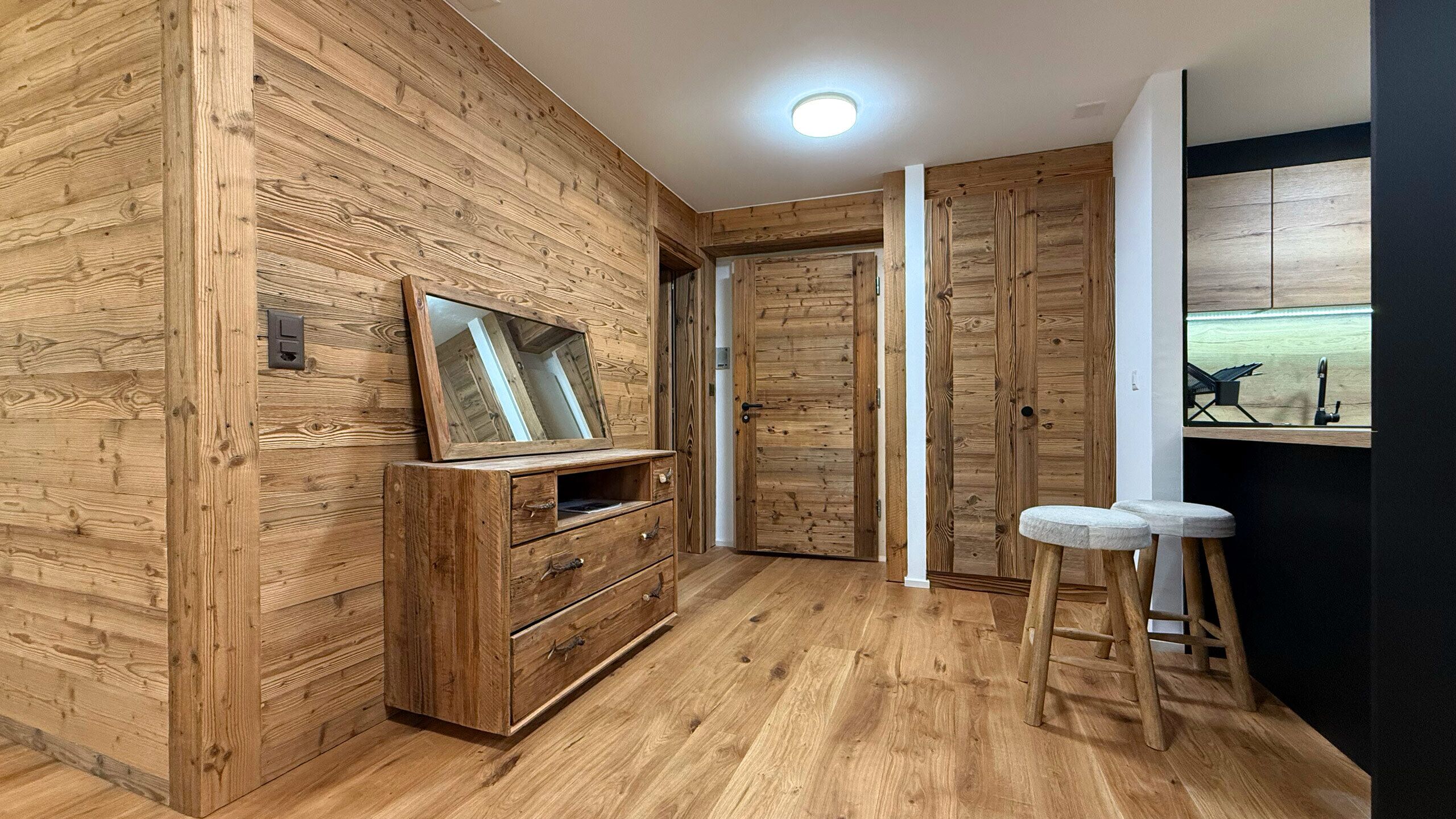 The apartment seduces from the moment you enter with its alpine contemporary style, blending natural wood and modern finishes.