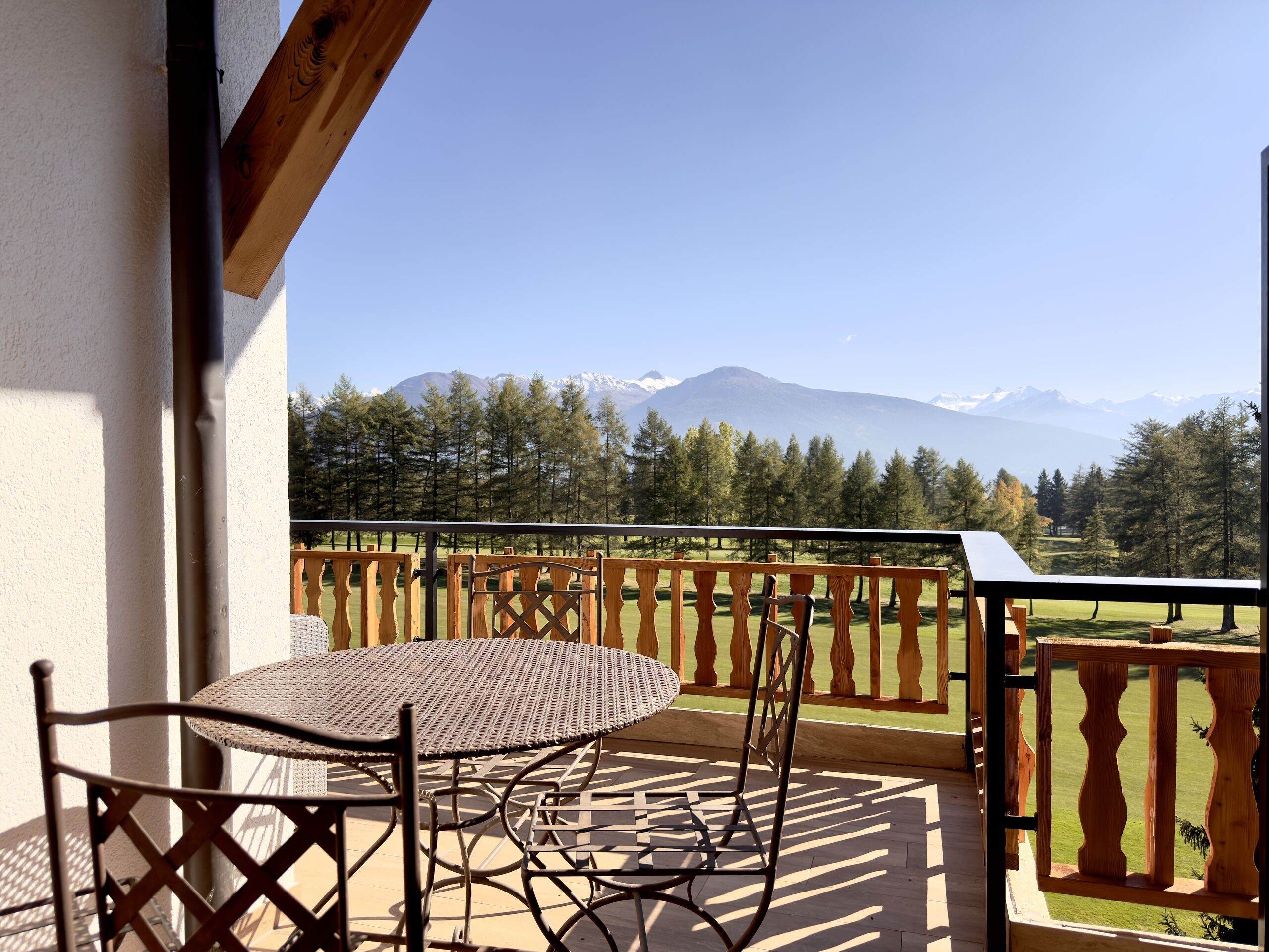 Situato al quinto piano di una residenza di qualità, questo luminoso e spazioso appartamento gode di una posizione esposta a sud, che offre una vista mozzafiato sul famoso campo da golf Ballesteros e sulle montagne del Vallese.